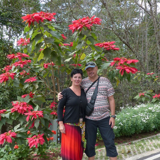 Het paleis van de koning is ook een enorme tuin waar allerlei soorten planten bloeien. Niet alleen lokale planten, maar ook rozen, dahlia’s, leeuwenbekjes en geraniums! Wat een leuk contrast was, is een bol margrieten onder een kerstster boom.